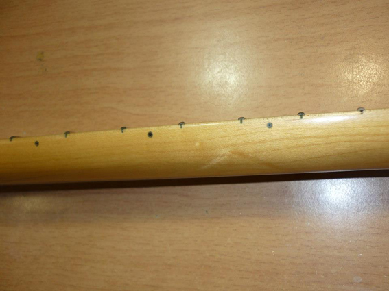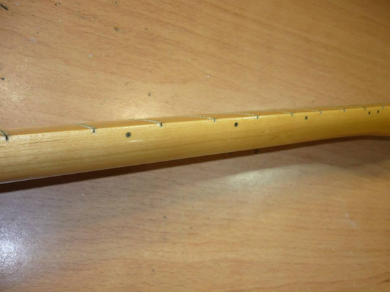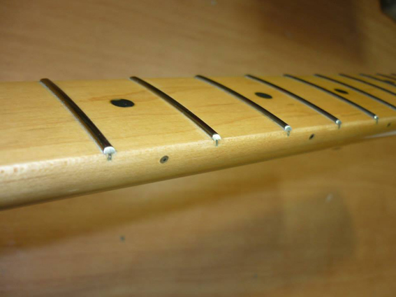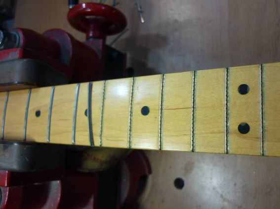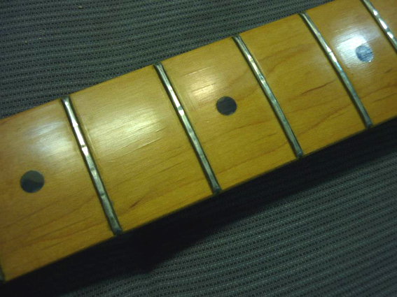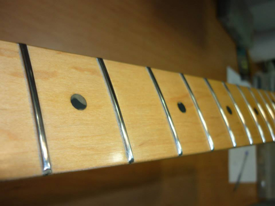 Με την πάροδο των χρόνων, έχουν εξελιχθεί σε πολύ ικανοποιητικό βαθμό οι τεχνικές που χρησιμοποιώ για τις maple ταστιέρες. Είναι σύνηθες φαινόμενο μια τέτοια ταστιέρα να γυρνάει μετά από μια ταστοδουλειά με ξεφλουδισμένα κομμάτια βερνικιού, έντονες ασπρίλες ή μαυρίλες κτλ. Δεν είναι άξιο απορίας γιατί συμβαίνει αυτό, τα τάστα τις περισσότερες φορές είναι θαμμένα μέσα στο βερνίκι και μοιάζει αδύνατο να αφαιρεθούν χωρίς τον τραυματισμό του. Αυτό ήταν πάντα μια πρόκληση για μένα, σας παρουσιάζω μια δουλειά πάνω σε βερνίκι που είναι έτοιμο να ξεκολλήσει χωρίς τη βοήθεια τη δικιά μου. Θα δείτε ότι μένει ανέπαφο ως το τέλος.