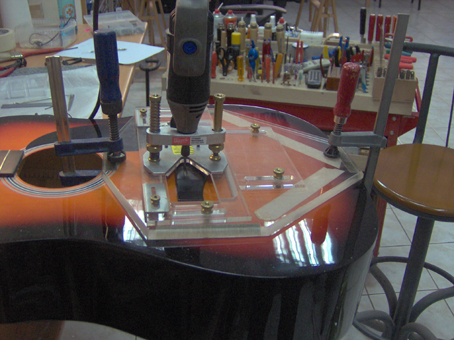Η τιμή δε συμπεριλαμβάνει τον κρύσταλλο.Η εργασία αυτή είναι λεπτή και απαιτείται απόλυτη ακρίβεια στη εκτέλεσή της ώστε να δουλέψει ο κρύσταλλος καλά. Στο πρώτο στάδιο υπολογίζεται η γωνία που σηκώνεται η γέφυρα υπό την τάση των χορδών. Η μέτρηση υπολογίζεται με ειδικό πιεσόμετρο και καταγράφεται. Αφού αφαιρεθούν οι χορδές, προσομοιώνεται το ίδιο τράβηγμα ενώ αυτές λείπουν. Αυτό το κάνουμε για να σκαφτεί η γέφυρα σωστά και να δεχτεί τον κρύσταλλο με τέτοιο τρόπο, που να μην εμποδίζεται η σωστή επαφή κρυστάλλου και saddle όταν οι χορδές επιστρέψουν. Στο επόμενο στάδιο γίνεται το σκάψιμο της εγκοπής saddle, τρύπημα για το καλώδιο του κρυστάλλου και τέλος τρύπημα για output jack.